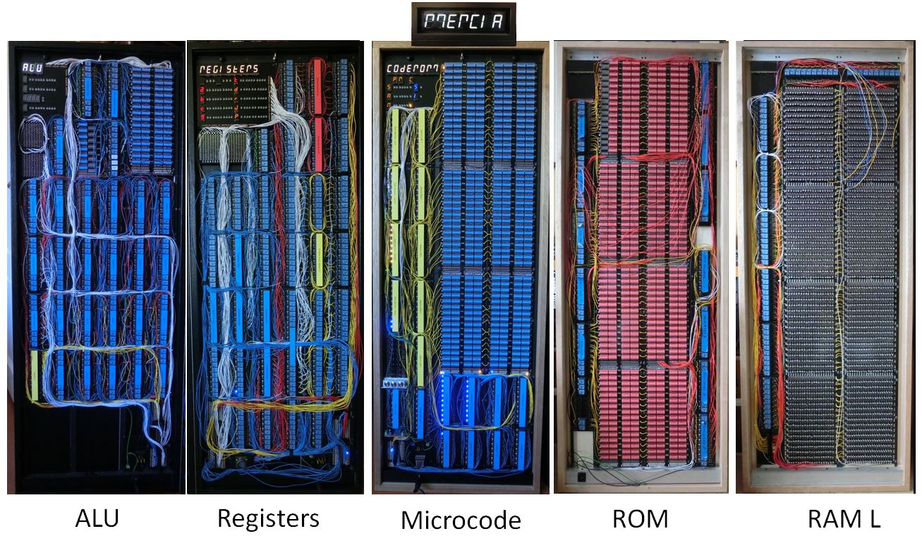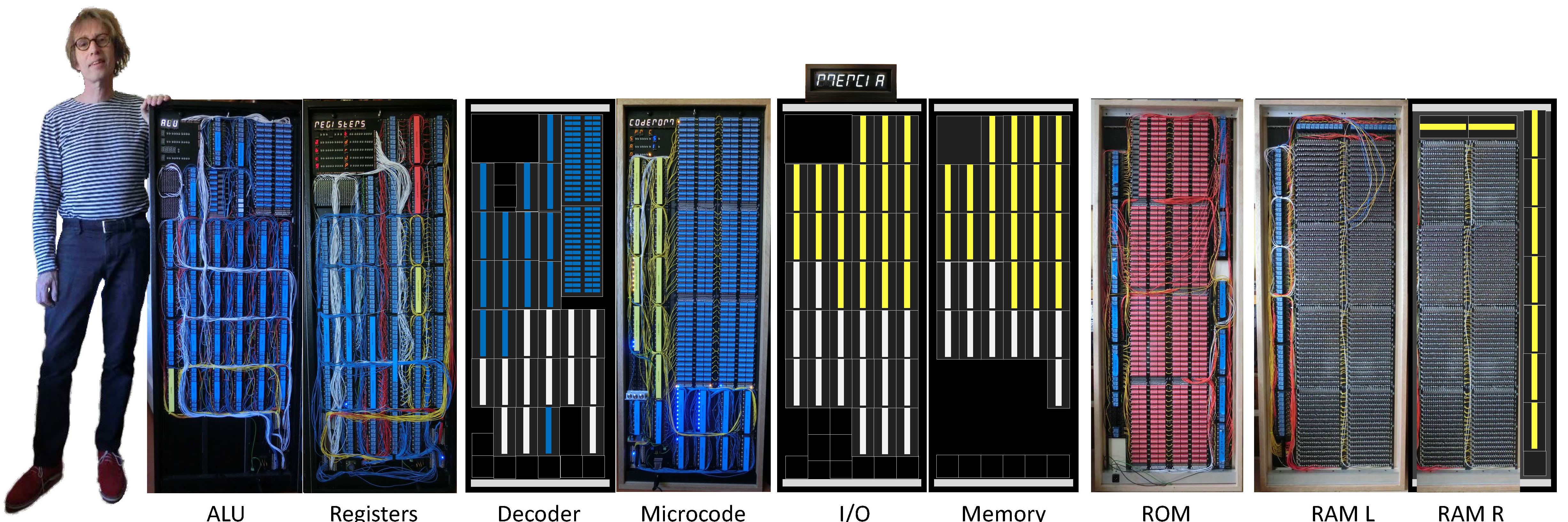 MERCIA will be used to educate children and students about the working of a computer. MERCIA has design features that support this goal. First, a relay is chosen as primary switching element, because it is the most basic element. Everybody can understand its working principle. Secondly, attractive colors for different signals and components are used: blue is used for control signals, red is data, yellow resembles addresses and white I/O signals. Finally every panel contains a display in the top left corner that shows information about the working of the panel. On this site you'll find the technical description of the computer. A progress update on the project and build log can be found on facebook.