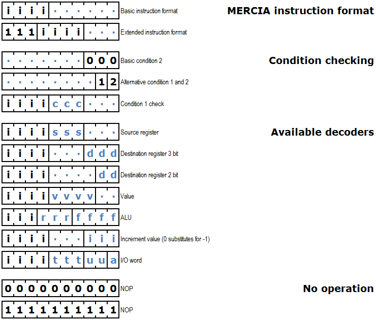 MERCIA's instruction set consists out of a basic set of 14 two operand instructions and 16 one operand extended instructions. The instruction set is entirely defined by DIP switch settings. However there are some conditions that need to be met: