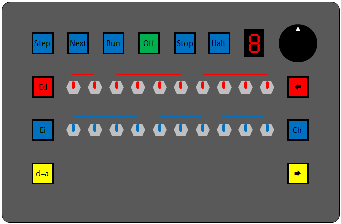 Every computer needs a operator console. Since all the important computer information is shown on the panels, MERCIA’s console has mainly input switches. The only exception on that is the 7-segment display that shows the current active register. The console is connected with a 37-core cable to the register panel.
