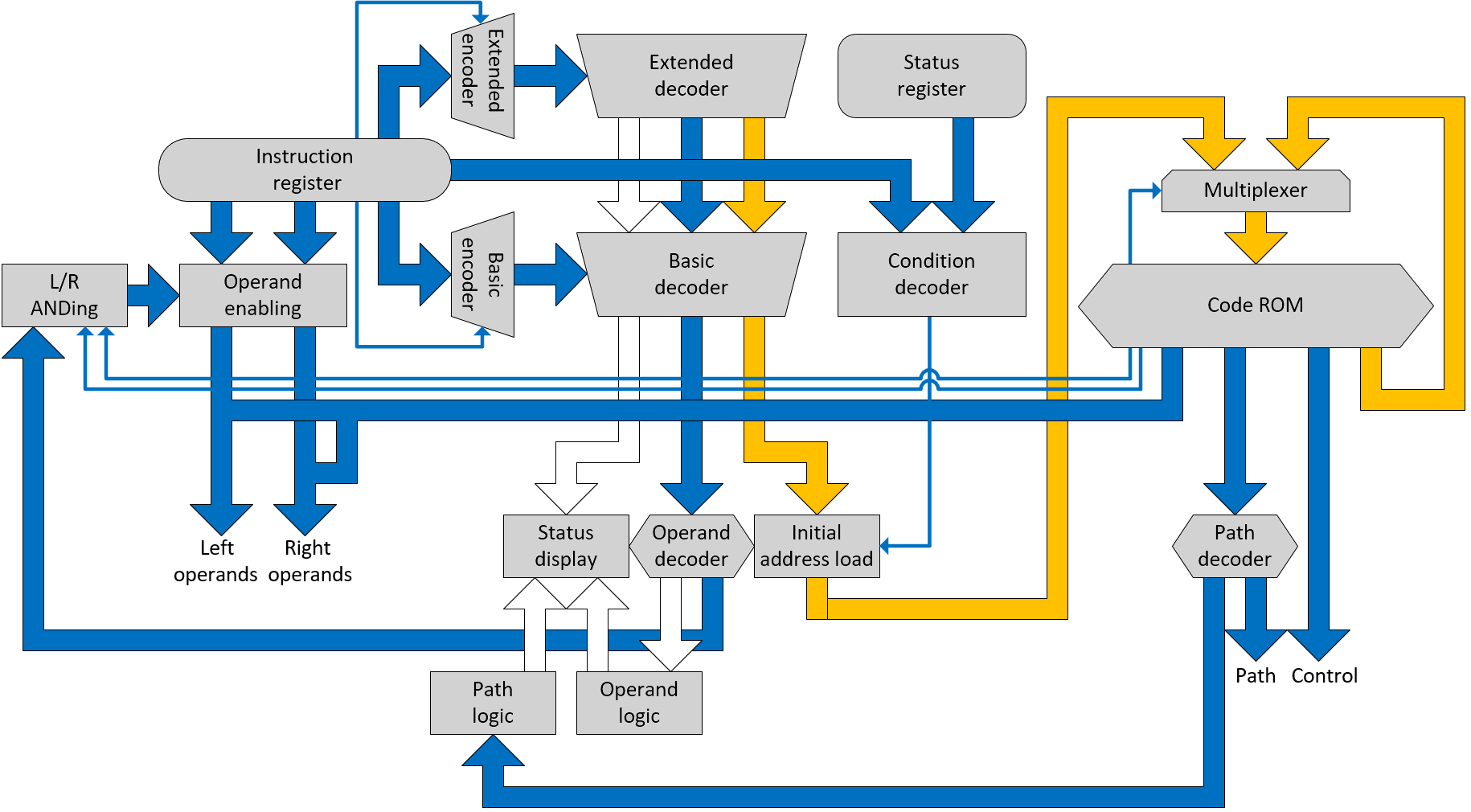A functional block diagram of all the components of the instruction decoder. The Basic and Extended coder/decoder together form the instruction map.