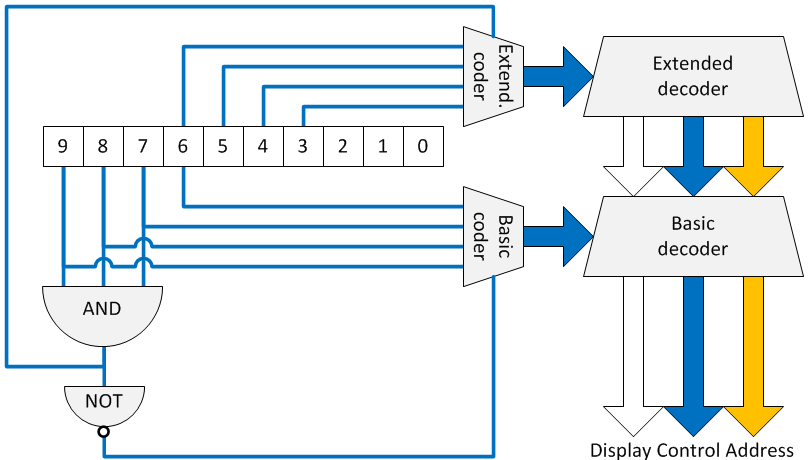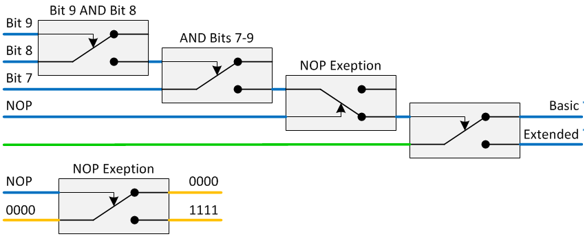 An AND-gate is used to decide if the instruction is an basic or extended instruction. Both decoders – the basic as well the extended decoder – are always active. But only one decoder will be enabled by this AND-gate.