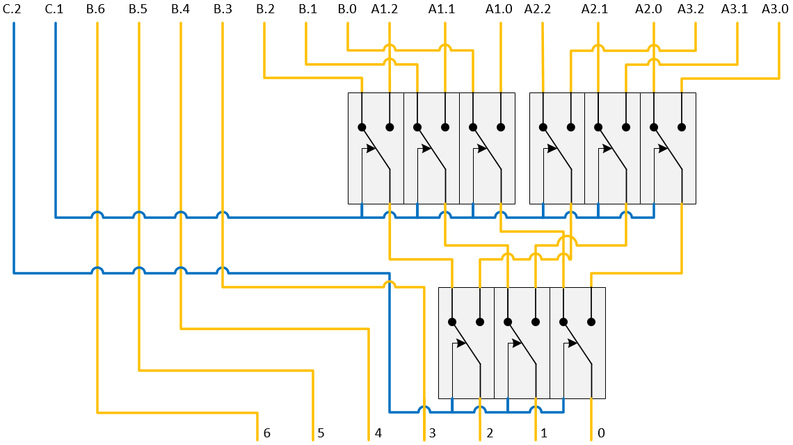 The instruction register has NOP detection, as described in the register article. IF NOP is detected, two relays are switched on to select instruction 1111xxxxxx in the basic instruction map. The first relay ensures that the basic set is always chosen (top circuit diagram). The second relay is placed behind the basic map decoder for instruction 0000 and forces this to basic instruction 1111 (bottom circuit diagram).