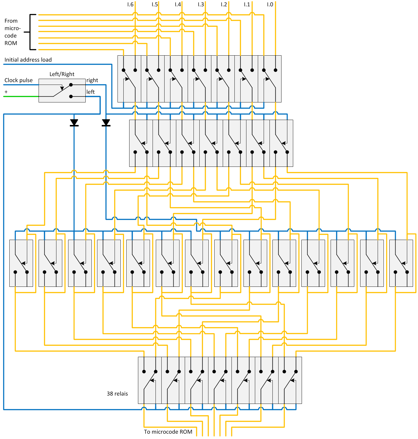 The control lines originate in the console. The Step, Next and Stop signals are coded, because the console uses a 50pin connector and are not enough lines available to give every signal its own line/pin. Run will start the clock and Stop will stop the clock. Step will execute one microcode step, Next will execute the next instruction and Halt will stop the clock only when the instruction is finished. Fetch instruction is the microcode signal that fetches a new instruction start address from the instruction map. The relay logic for the clock is shown in the next circuit diagram.