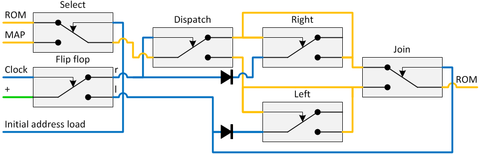 Left and right, the output of the clock, is input for the microcode step logic. For this two alternating registers are used, referred to as left and right. When the left register is used to point to the current microcode address, the right register is loaded with the new address from the instruction map and vice versa. MERCIA’s clock generates the signals to alternately change between the left and right register. The one bit principle is shown below.