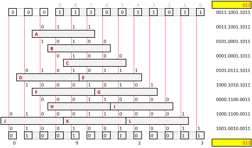 This conversion can be done by the ALU, but would be very time consuming because two 10-bit words are involved in the conversion. Therefore I choose a hardware implementation. A good description for this hardware implementation can be found here: http://www.johnloomis.org/ece314/notes/devices/binary_to_BCD/bin_to_bcd.html