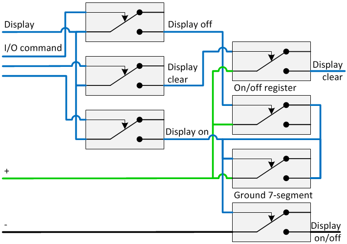 The display can be set on by connecting all the segments of the display to the ground. It can be set off by breaking this ground connection. The clear command will reset all memory relays, using a special clear line as shown in the Memory section. Clearing individual displays can be done by writing a zero to the related memory word. Those three commands are implemented by the following relay circuit diagram.