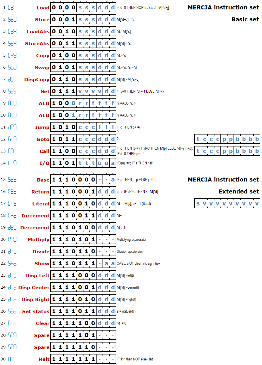 MERCIA has a four bit instruction code, as well in the 14 basic instructions as the 16 extended instructions. At this moment there are 28 instructions defined.