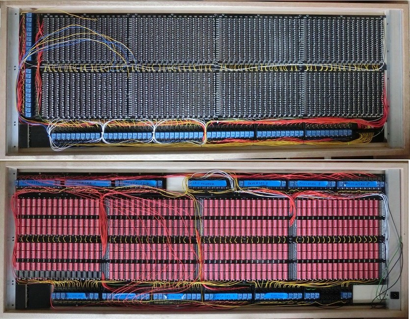 For the capacitor Random Access Memory (RAM) memory the TIM-8 memory design from Rory Mangles is used (see: www.northdownfarm.co.uk/rory/tim/tim-8.htm). In this design capacitors are used to store the bits. Each capacitor holds enough power to switch a relay on for a very brief period. However this is enough to store the bit in a memory register.